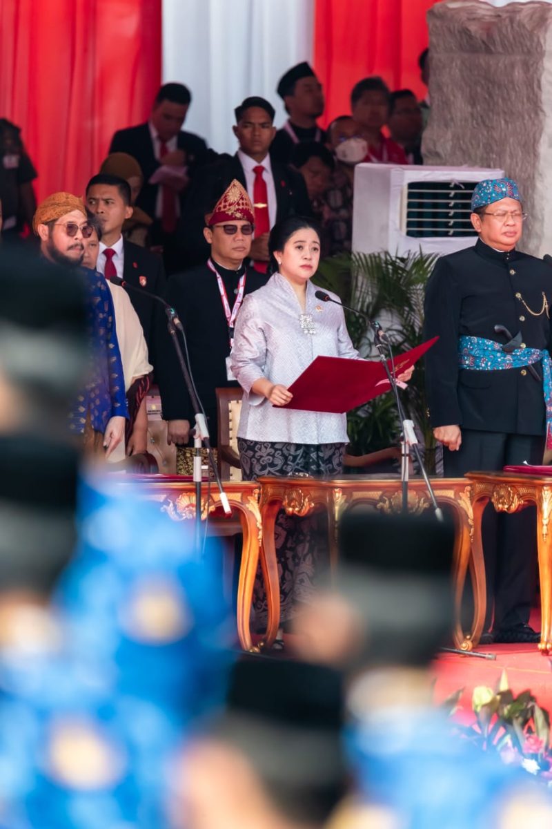 Mengenakan kebaya, Puan membacakan teks pembukaan UUD 1945 dengan lantang dari atas podium.