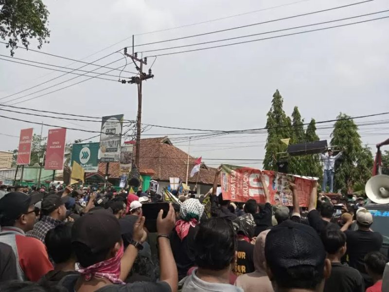 terlihat ribuan massa menggelar aksi unjuk rasa tepat di depan Kantor Kecamatan Parung Panjang. Sementara arus lalu lintas di depan Kantor Kecamatan Parung Panjang pun terpaksa ditutup oleh ribuan massa.