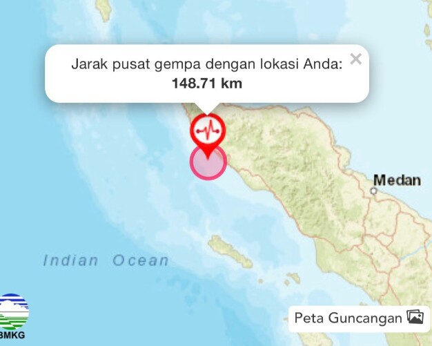 Sementara itu titik koordinat gempa berada di 4,25 lintang utara (LU) dan 95,70 bujur timur (BT). Pusat gempa berada di kedalaman 56 km.