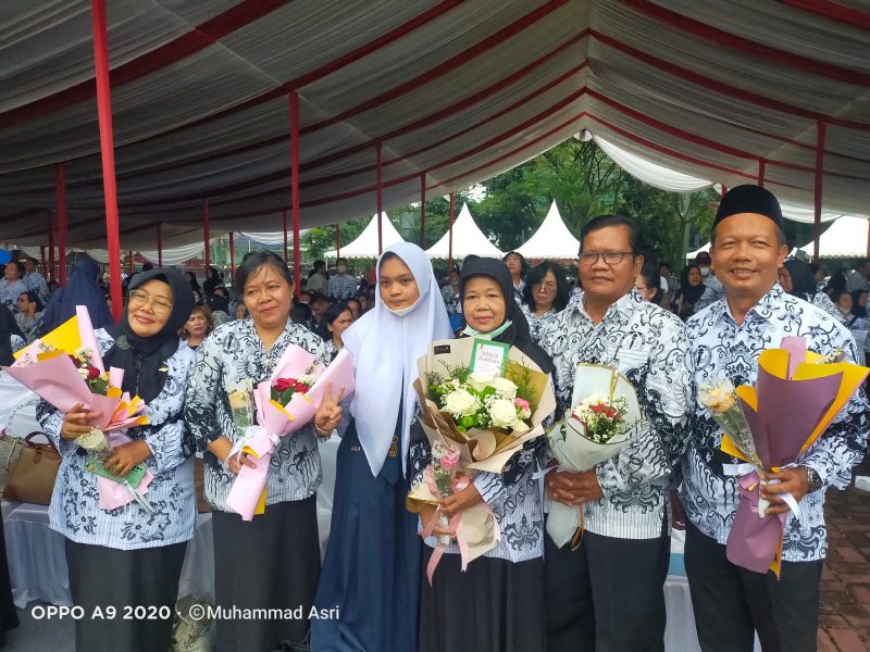 Kepala UPT SMP Negeri 7 Dra Hj Irnawati MM bersama para guru dan ratusan muridnya, mengikuti upacara Peringatan Hari Guru Nasional yang digelar Pemerintahan Kota Medan di Lapangan Benteng, Jumat (25/11/2022).