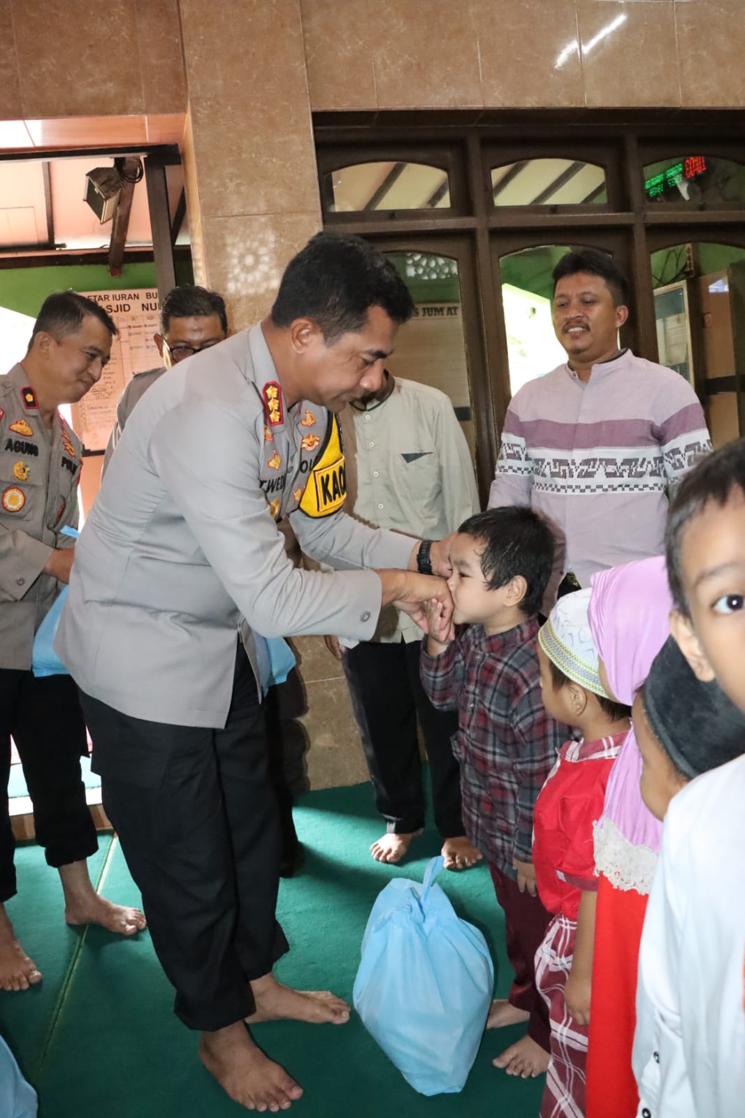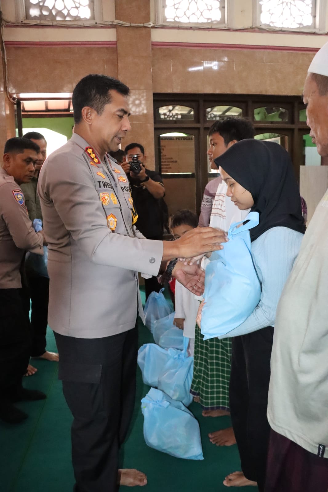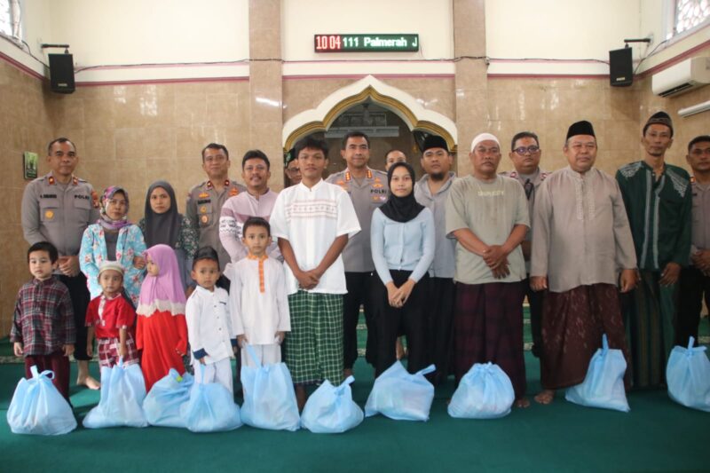 Dengan penuh kehangatan, Kapolres menyerahkan bantuan secara langsung, disambut senyum tulus dari para penerima dan jamaah yang hadir.