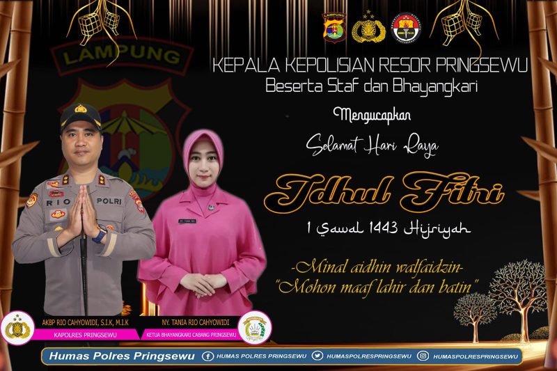 Pringsewu Jurnalis Investigasi News. Com– Kapolres Pringsewu Polda Lampung, AKBP Rio Cahyowidi, S.IK, M.IK bersama Ketua Bhayangkari Cabang Pringsewu Ny. Tania Rio Cahyowidi, menyampaikan ucapan selamat Idul Fitri serta memohon maaf lahir dan batin kepada masyarakat Pringsewu, awak media dan seluruh personil Polres Pringsewu.
