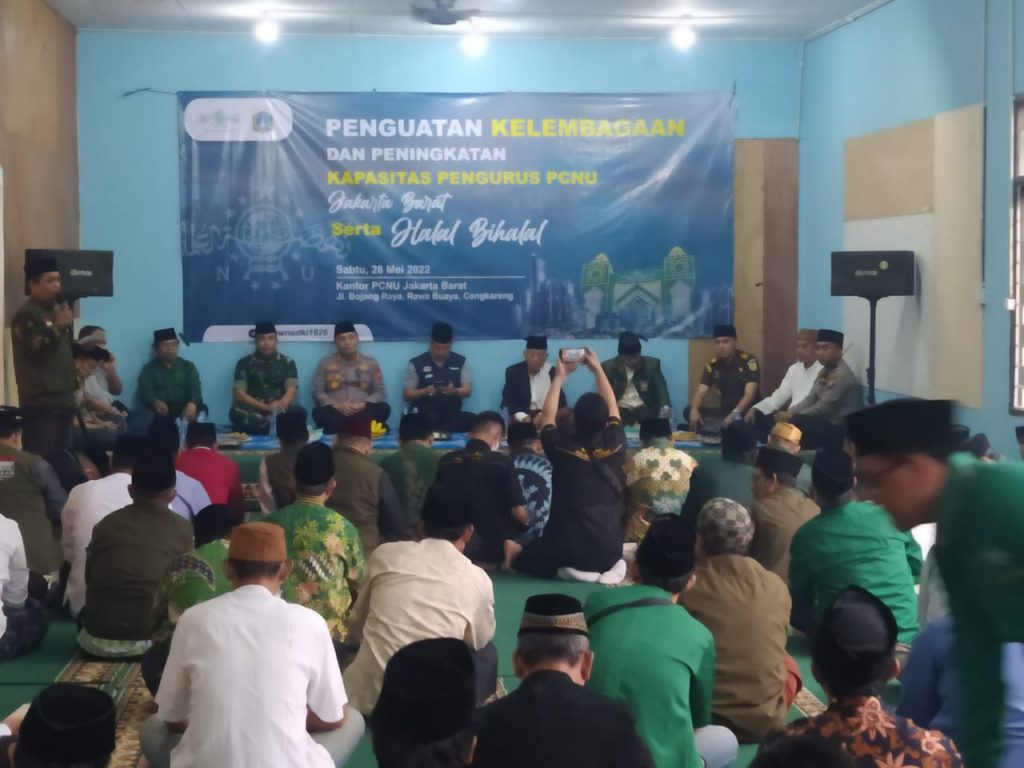 Jakarta–Jurnalis Investasi News.Com– Kodim0503/JB. Dalam rangka Suasana akrab hadir dalam Aula Kantor sekertariat PCNU Jakbar dalam rangka menghadiri Kegiatan Penguatan Kelembagaan dan Peningkatan Kapasitas Pengurus PCNU Jakarta Barat serta Halal Bihalal yang dilaksanakan di Kantor Sekertariat PCNU (Pengurus Cabang Nahdatul Ulama) yang bertempat di Jln. Bojong Raya Rt.14 Rw.04 Kelurahan Rawa Buaya Kecamatan Cengkareng kota Administrasi Jakarta Barat. Sabtu (28/05/2022).