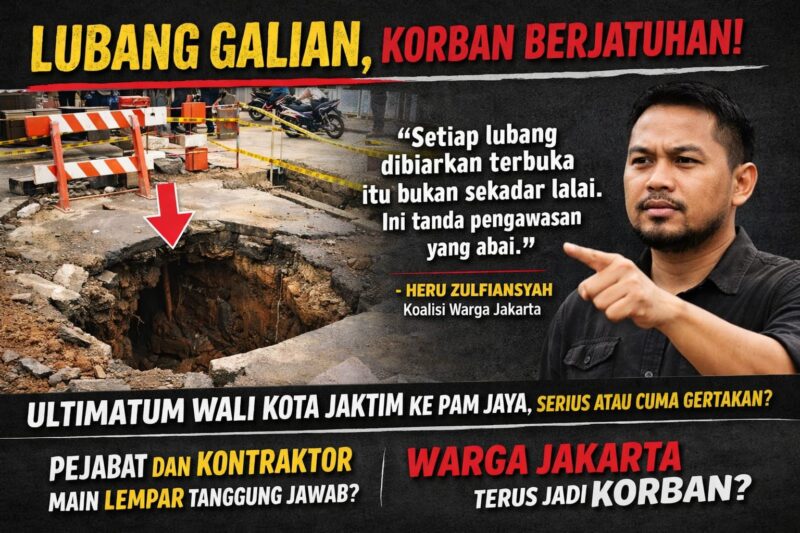 Koalisi Warga Jakarta mencatat, lubang galian sering dibiarkan terbuka tanpa pengamanan memadai, minim penerangan di malam hari, serta ditutup secara asal sehingga membahayakan pengguna jalan.