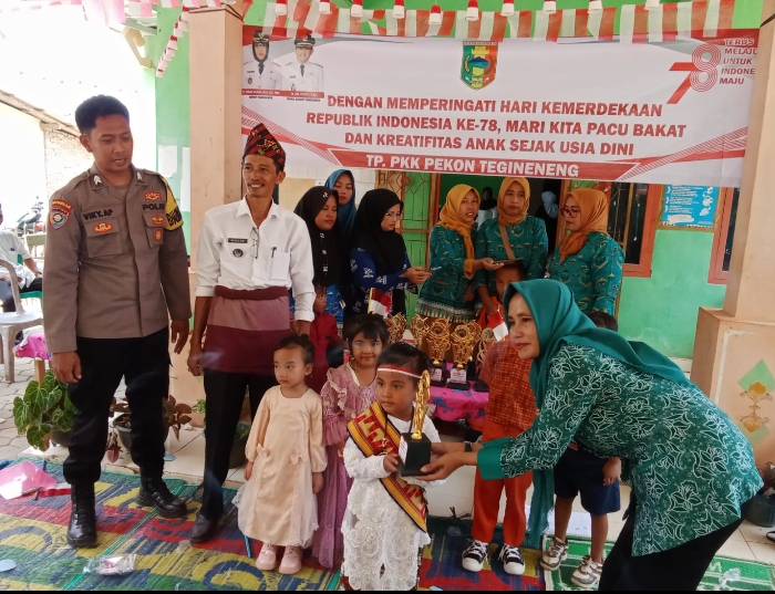 Muslim selaku kepala pekon dalam sambutannya menjelaskan dengan memperingati Hari Kemerdekaan RI KE-78,dengan Tema pekon Tegineneng memacu BAKAT DAN KREATIFITAS ANAK SEJAK USIA DINI ucapnya