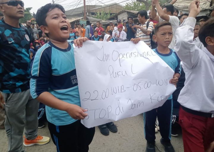 Tangerang-jurnalis investigasi news., Tak terima rekan mereka terlindas truk pengangkut tanah, puluhan siswa-siswi Sekolah Dasar (SD) Negeri Salembaran 2, Kecamatan Kosambi menggelar aksi sambil menangis dan membentangkan poster bertuliskan “Jam Operasional Truk Tambang Mulai dari Pukul 22:00 WIB, hingga Pukul 05:00 WIB, stop di jam kerja”