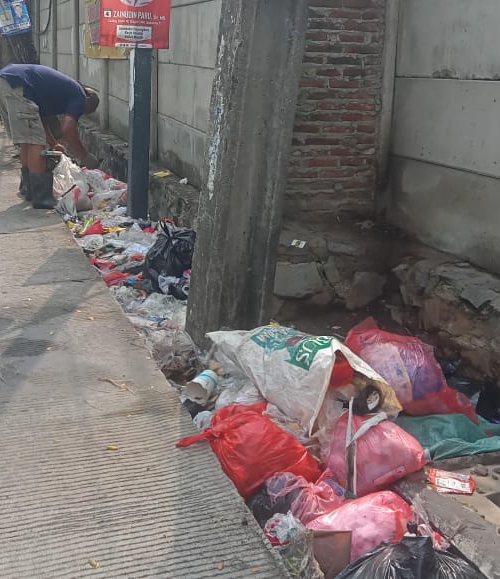 Jakarta- Sampah menumpuk dan berceceran di pinggir jalan kampung Bulak Teko samping RS Mitra Keluarga, RW 11 Kelurahan Kalideres Kecamatan Kalideres Jakarta Barat.