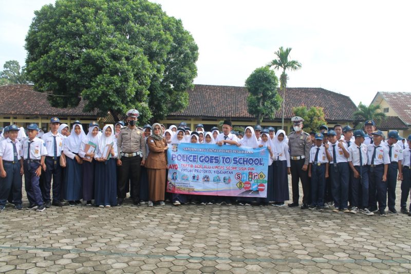 Tanamkan budaya tertib berlalu lintas sejak dini, Satuan Lalu Lintas (Satlantas) Polres Pesawaran Polda Lampung menggelar kegiatan “Police Goes To School”, untuk mensosialisasikan dan memeberikan himbauan tentang tertib keselamatan berlalu lintas di SMP Negeri 18 Pesawaran, Kecamatan Negri Katon, Kabupaten Pesawaran, Senin (22/08/22) Pukul 07.30 Wib.