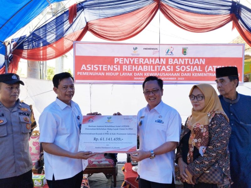 Pesawaran Lampung Jurnalis Investigasi News Com – Bupati Pesawaran bersama Sentra “Handayani” menyerahkan bantuan Asistensi Rehabilitasi Sosial (ATENSI) dari Kementerian Sosial RI kepada masyarakat dengan kondisi sosial ekonomi yang rentan di Desa Pekon Ampai Kecamatan Marga Punduh Kabupaten Pesawaran, Kamis (16/11/2023).